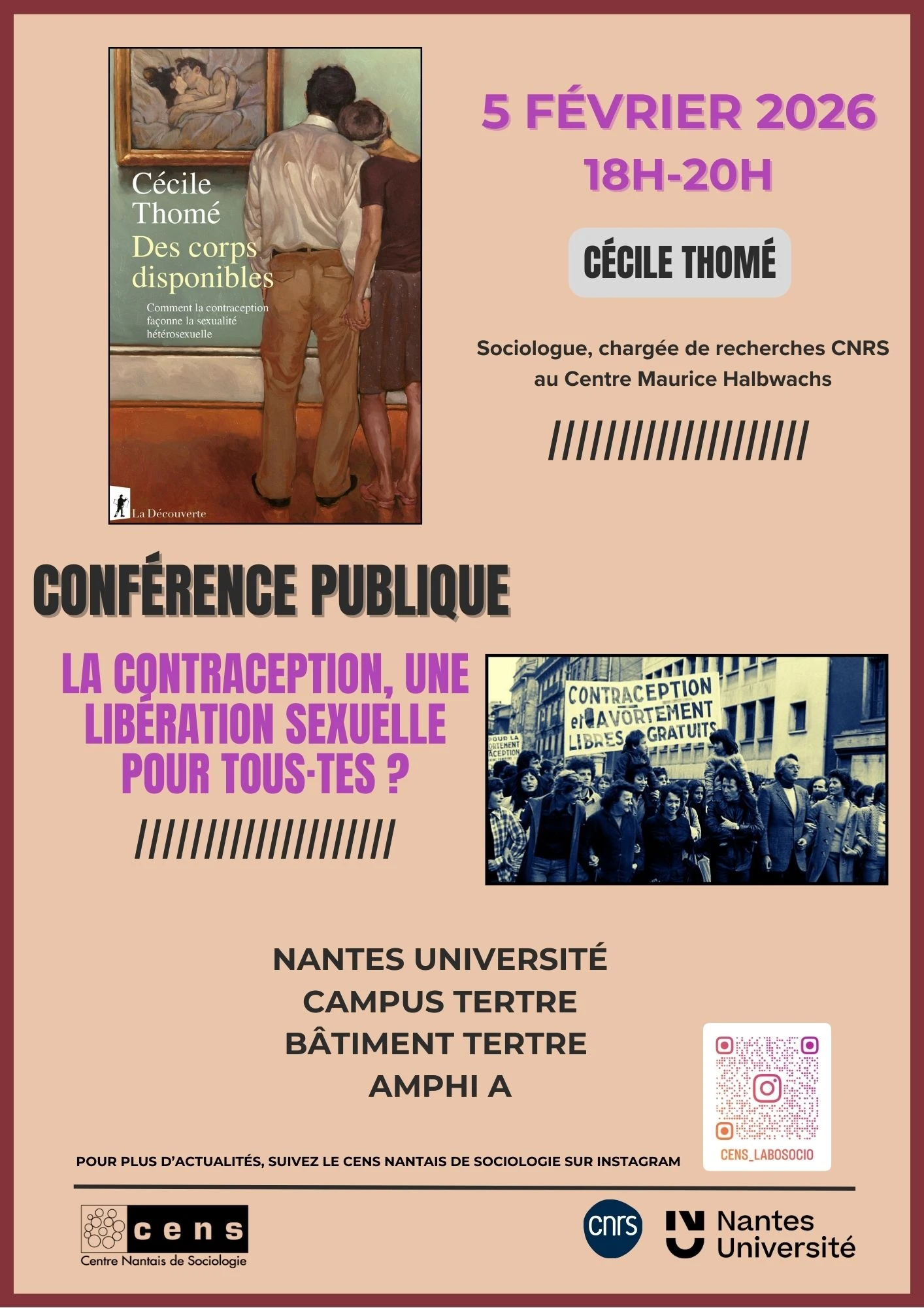 Cécile Thomé est sociologue, chargée de recherches au CNRS au Centre Maurice Halbwachs. Elle a publié l'ouvrage Des corps disponibles. Comment la contraception façonne la sexualité hétérosexuelle aux éditions La Découverte, en 2024. Cette conférence publique se veut largement accessible et ouverte à toutes et tous. Elle sera suivie d'un temps d'échange et de débat avec le public.